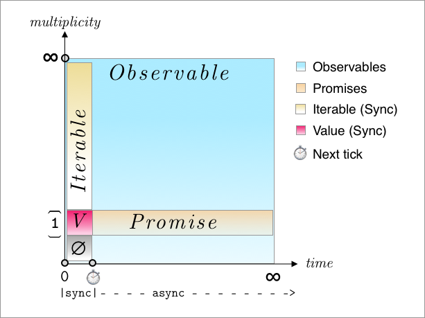 This graph will succinctly say what the rest of this post will elaborate: Promises, singular values, they are all specializations of Observables. Promises only can hold future values - not present ones. Observables can hold either. Promises can't be canceled. Observables are always cancelable (but could have a no-op cancelation function). So if you regularly mix synchronous and asynchronous data, as in most web apps, composing with Observables will result in generally cleaner code than with Promises. You treat data the same whether it arrives singly or multiply, and whether it exists in the present (sync) or the future (async).